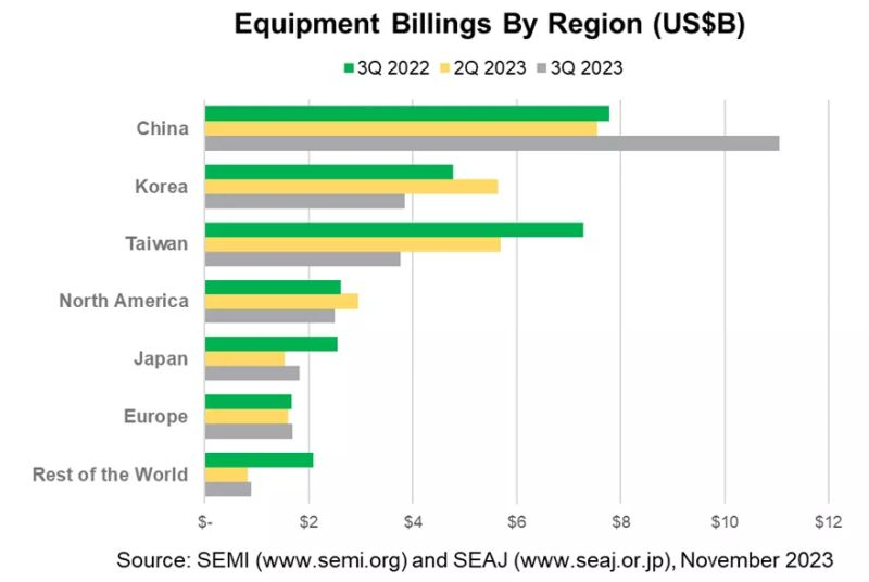 O maior comprador de equipamentos de produção de chips depois da China no terceiro trimestre foi a Coreia do Sul, que gastou 3,85 mil milhões de dólares nestas necessidades, o que representa 19% menos do que no ano anterior e 32% menos do que no segundo trimestre deste ano. Taiwan ficou apenas ligeiramente atrás da Coreia do Sul, gastando 3,77 mil milhões de dólares na compra de equipamentos, mas isto foi 48% menos do que no ano anterior. A América do Norte reduziu os gastos minimamente, em 5%, para 2,5 mil milhões de dólares, o Japão caiu 29%, para 1,82 mil milhões de dólares, mas a Europa conseguiu aumentar os gastos em 2%, para 1,7 mil milhões de dólares, bem como em 5% sequencialmente.