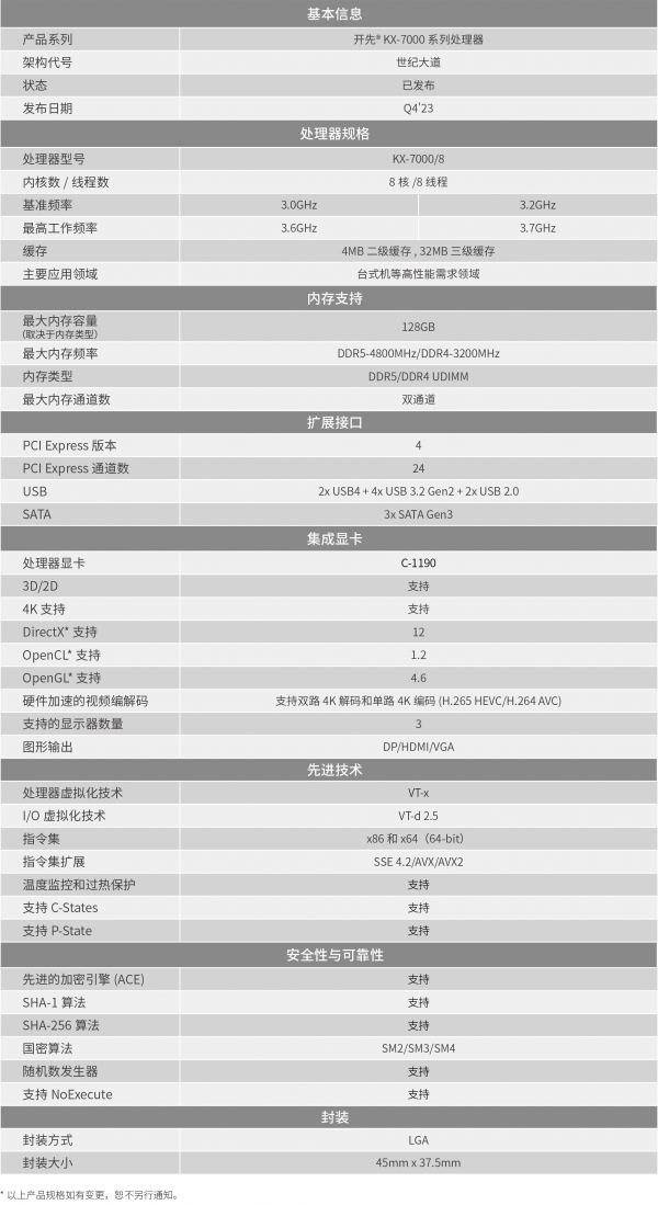 O novo processador KX-7000, produzido com tecnologia de processo de 7 nm, usa a arquitetura central Century Avenue compatível com x86, para a qual o fabricante afirma um aumento duplo no desempenho em comparação com os chips da série KX-6000. O novo produto inclui suporte para conjuntos de instruções VT-x, BT-d 2.5, SSE4.2/AVX/AVX2, bem como controle de indicadores C-State e P-State.