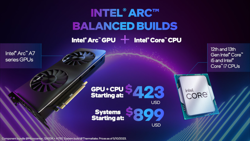 A Intel lançou o programa Balanced Builds, no qual pretende vender kits de seus processadores e placas de vídeo – eles são direcionados a gamers e construtores de PCs que poderão escolher as configurações ideais. Um dos primeiros kits incluía um processador Intel Core i5-12600K e uma placa de vídeo Intel Arc A750, ao preço de US$ 423.