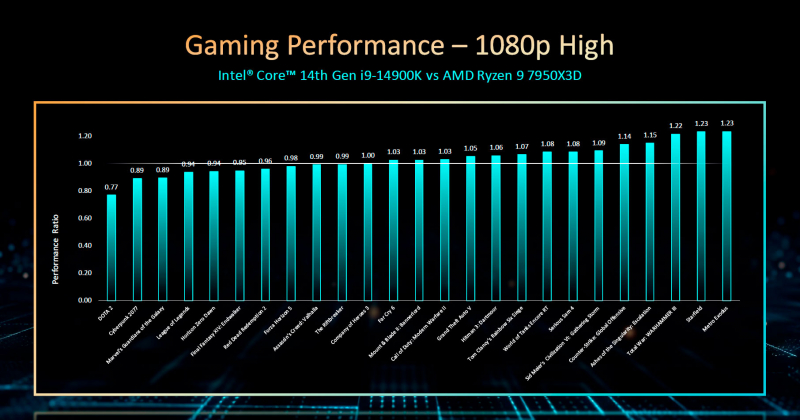 A Intel não comparou o Core i9-14900K com seu antecessor, mas comparou o novo carro-chefe com concorrentes representados por AMD Ryzen 9 7950X, Ryzen 9 7950X3D e Ryzen 7 7800X. A Intel admite que em alguns jogos seu novo produto é inferior ao Ryzen 9 7950X3D, mas na maioria dos casos ainda é mais rápido – até 23%.