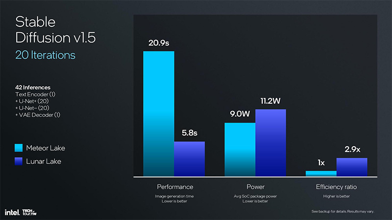 Para ilustrar de forma prática os recursos da rede neural do Lunar Lake, a Intel mediu o tempo de execução de 20 iterações no Stable Diffusion – o novo processador completou a tarefa quatro vezes mais rápido que o Meteor Lake, gastando apenas um quarto a mais de energia.