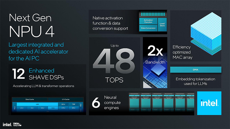 A unidade Lunar Lake NPU acaba sendo superior a esta barra, em contraste com o Meteor Lake anterior, que tem um desempenho NPU de 11,5 TOPS. Para obter o nível de desempenho necessário, a Intel adicionou pipelines adicionais ao NPU do novo processador – agora são seis em vez de dois, e também aumentou as frequências. Ao mesmo tempo, as NPUs continuam a ser estruturalmente baseadas na arquitetura Movidius Myriad X, introduzida em 2018.