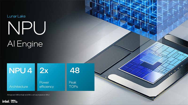 Falando sobre as principais vantagens dos processadores móveis Lunar Lake apresentados hoje, a Intel destacou uma melhoria de 40% na eficiência energética e o coprocessador NPU 4 AI, cujo poder computacional triplicou (em comparação com Meteor Lake). O NPU merece muita atenção porque, graças ao seu desempenho aumentado de até 48 TOPS (trilhões de operações por segundo), os processadores Lunar Lake podem se tornar a base de laptops que atendem aos requisitos do Copilot+ PC da Microsoft.