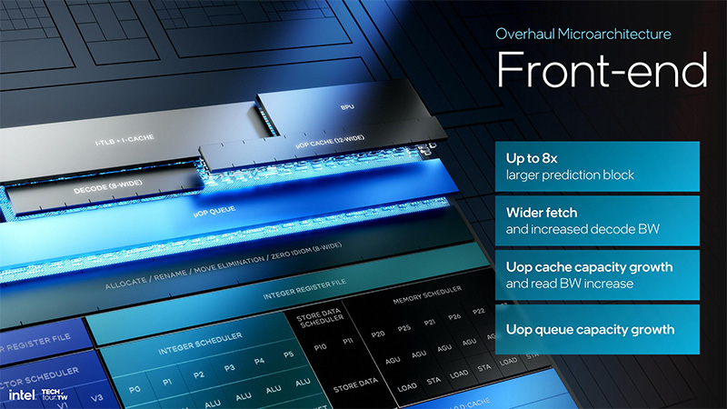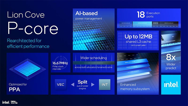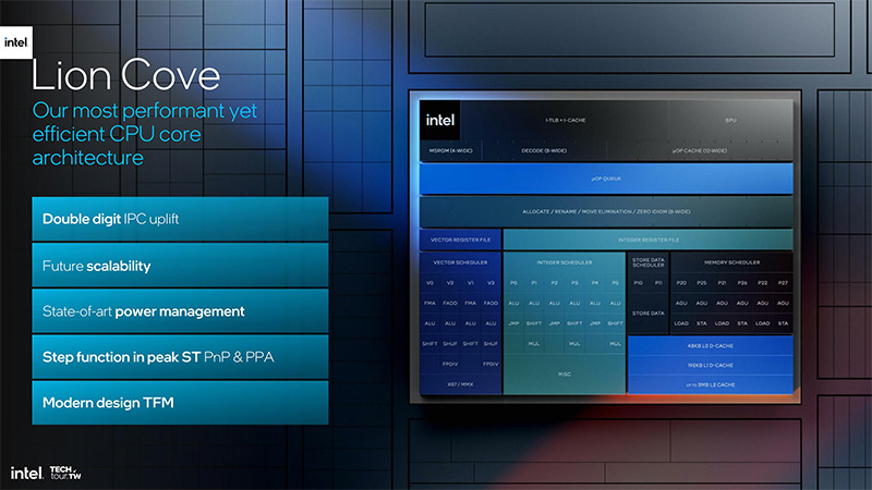 Ao contrário do Redwood Cove, que tinha pequenas diferenças em relação aos núcleos Golden Cove anteriores, no Lion Cove os desenvolvedores da Intel implementaram inovações em grande escala. A unidade de previsão de ramificação do novo núcleo foi expandida 8 vezes em comparação com a arquitetura anterior. O rendimento de transferência L2 para o cache de instruções é triplicado e o rendimento de busca de instruções é duplicado de 64 para 128 bytes por ciclo de clock. Além disso, a taxa de decodificação aumentou de 6 para 8 instruções por ciclo de clock, além de aumentar o tamanho e a velocidade do cache de microoperação.