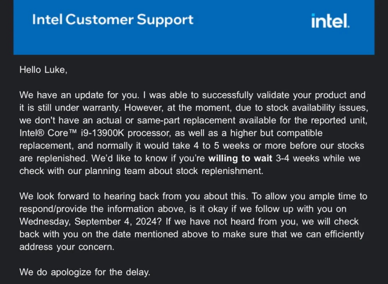 Um leitor do fórum Reddit relatou que seu carro-chefe Core i9-13900K começou a mostrar sinais de instabilidade. Ele entrou em contato com o suporte técnico da Intel e passou por uma verificação confirmando que era o dono do chip e que o processador ainda estava na garantia. No entanto, um representante do suporte técnico disse que a empresa não pode atualmente substituir o problemático Core i9-13900K pelo mesmo processador devido a “dificuldades com a disponibilidade de processadores em estoque”. O suporte técnico também informou que também não é possível substituir o chip problemático por um Core i9-14900K mais moderno devido à sua indisponibilidade.