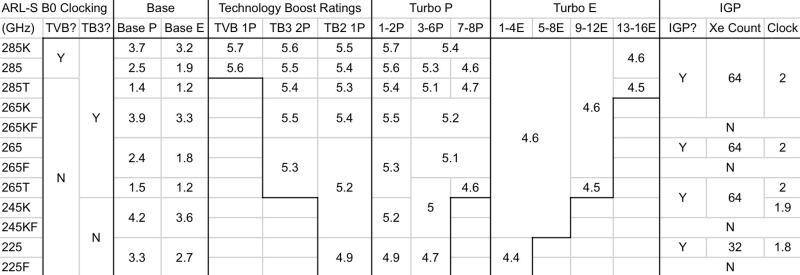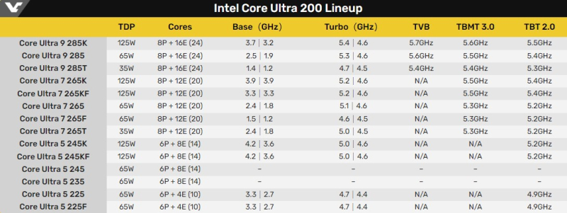 Como parte da série de processadores Core Ultra 200, são esperados cinco modelos de processadores com os sufixos “K” ou “KF”. O modelo principal Core Ultra 285K, segundo a fonte, receberá imediatamente suporte para todas as tecnologias de overclock automático, incluindo Thermal Velocity Boost (TVB), Turbo Boost Max 3.0 e o clássico Turbo Boost 2.0. Graças a isso, o processador poderá operar em frequências de até 5,7 GHz (em dois núcleos). O chip usa 8 núcleos Lion Cove P com frequência base de 3,70 GHz e 16 núcleos Skymont E com frequência base de 3,20 GHz. Em todos os núcleos P simultaneamente, o chip será capaz de operar em frequências de até 5,4 GHz. A frequência máxima do E-core do processador será de 4,60 GHz. O chip também inclui 64 unidades de execução de gráficos Arc integrados com frequência de 2,0 GHz.