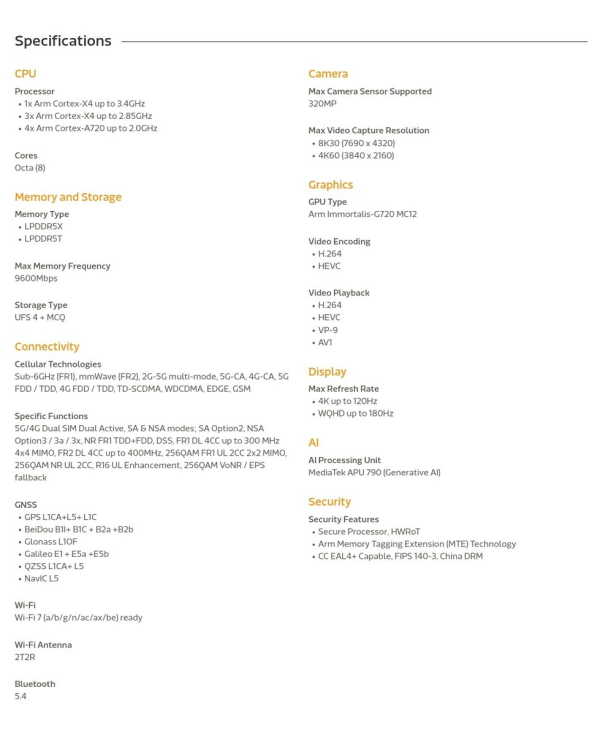 O Dimensity 9300+ usa o mecanismo de IA atualizado MediaTek APU 790 (unidade de processamento de IA). Ele usa a nova tecnologia MediaTek NeuroPilot Speculative Decode Acceleration, que fornece um aumento de 10% no desempenho. A nova APU afirma suportar 01.Al Yi-Nano, Alibaba Cloud Owen LLM, Baichuan Al, ERNIE-35-SE, Google Gemini Nano, Meta✴ Llama 2 e Llama 3 – modelos de linguagem grande (LLM) com o número de suportados parâmetros de 1 a 13 bilhões com capacidade de escalar até 33 bilhões de parâmetros.