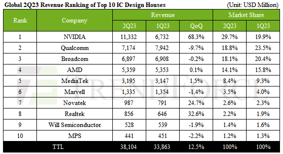 O terceiro trimestre está chegando ao fim, mas isso não impede que os especialistas da TrendForce resumam os resultados do segundo. Eles descobriram que a receita total dos dez maiores desenvolvedores de circuitos integrados no período passado cresceu 12,5%, para US$ 38,1 bilhões, e quase 30% desse valor veio da NVIDIA, que aumentou sequencialmente sua própria receita em 68,3%, para US$ 11. 3 bilhões, superando os concorrentes por uma grande margem.