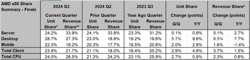 Se considerarmos o mercado de processadores de todos os tipos, com exceção dos semicustomizados e chips para o segmento de Internet das Coisas, então em termos físicos a AMD controla 24%, e em termos monetários 26,5%. Há um ano, estes valores eram inferiores em 0,9 e 0,6 pontos percentuais, respetivamente.