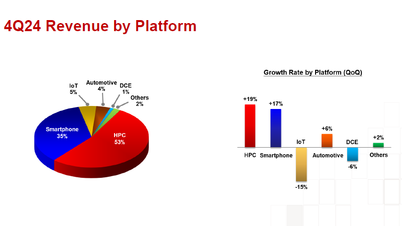 No final do ano como um todo, a participação da tecnologia de processo de 3nm na receita da TSMC atingiu 18%, enquanto a tecnologia de processo de 5nm e 7nm foi responsável por 34 e 17% da receita da empresa no período, respectivamente. Acontece que se em 2023 os processos técnicos avançados representavam 58% da receita da TSMC, então em 2024 a sua participação aumentou para 69%. Por segmento de mercado, a computação de alto desempenho representou 51% da receita anual da TSMC, enquanto os smartphones representaram 35%. Ao mesmo tempo, o primeiro segmento aumentou a sua participação nas receitas em 58% e os smartphones ficaram limitados a um aumento de 23%.