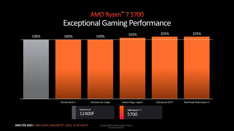 A AMD compara o modelo Ryzen 7 5700 com o Intel Core i5-12400F, observando uma vantagem de 5% de seu processador em jogos.