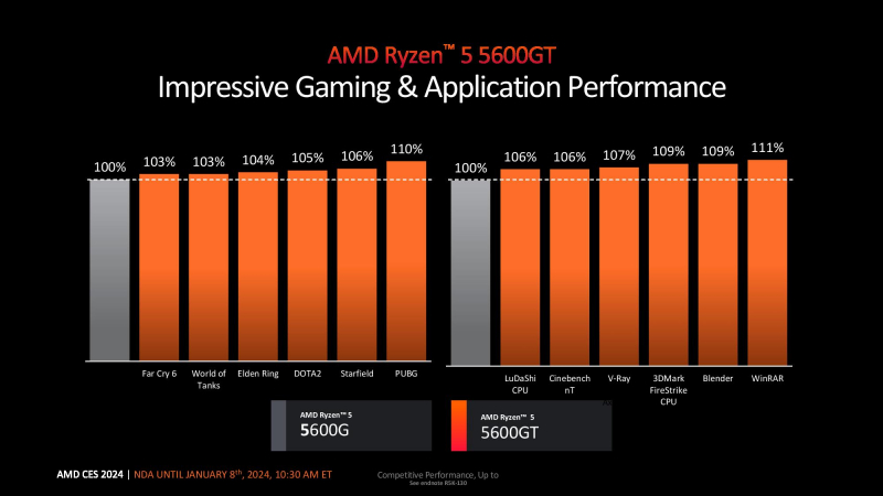 O fabricante compara os modelos Ryzen 5 5600GT e Ryzen 5 5500GT com o Ryzen 5 5600G e Ryzen 5 5500G. Segundo a AMD, o Ryzen 5 5500GT é até 3% mais rápido em jogos e até 10% mais rápido que seu antecessor em aplicativos. Por sua vez, o Ryzen 5 5600GT é até 10% mais rápido em jogos e até 11% mais rápido que seu antecessor em aplicativos.
