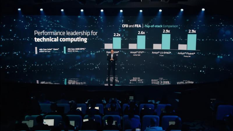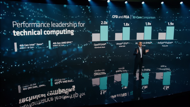 A AMD comparou o carro-chefe EPYC 9684X de 96 núcleos com o Intel Xeon 8490H de 60 núcleos em modelagem CFD e tarefas de análise de elementos finitos (FEA) relacionadas. O processador Genoa-X forneceu desempenho até 2,9 vezes mais rápido que o concorrente, e o modelo EPYC 9384X de 32 núcleos foi até 2 vezes mais rápido que o concorrente diante do Intel Xeon 8462Y + de 32 núcleos nas mesmas tarefas.