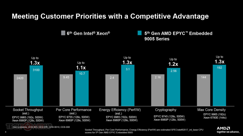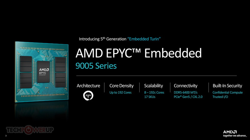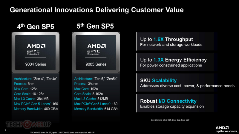 A série AMD EPYC Embedded 9005 inclui processadores com 8 a 192 núcleos, até 512 MB de cache L3, suporte para até 160 pistas PCIe 5.0 e até 614 GB/s de largura de banda de memória em 12 canais DDR5.