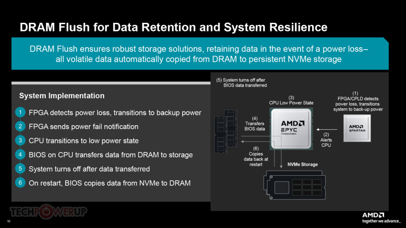 A série EPYC Embedded 9005 também oferece suporte à funcionalidade de despejo de DRAM, o que é importante para resiliência à perda de energia e recuperação rápida. Quando uma perda de energia é detectada, o processador imediatamente libera a memória para o armazenamento NVMe antes que a máquina seja desligada. Quando o sistema é reiniciado, o BIOS copia esse despejo de memória da unidade NVMe de volta para a DRAM.