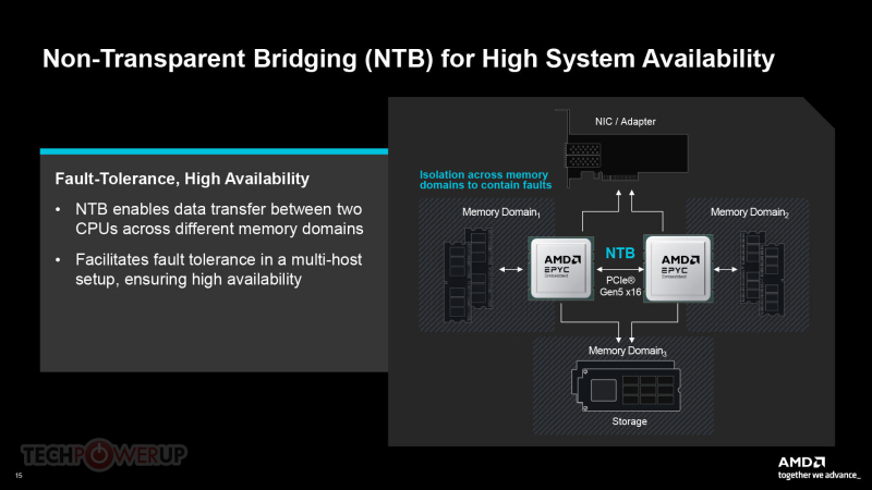 Assim como os chips regulares da série EPYC 9005, os processadores EPYC Embedded 9005 usam um design de chiplet, mas são equipados com recursos adicionais adaptados ao seu formato e casos de uso pretendidos. Por exemplo, eles suportam Non-Transparent Bridge (NTB), o que é importante para a formação de plataformas de controlador duplo. O NTB não usa Infinity Fabric ou mesmo CXL, mas uma conexão PCI-Express 5.0 x16 comum. O objetivo não é garantir a coerência do cache, mas absorver falhas em diferentes domínios de memória.