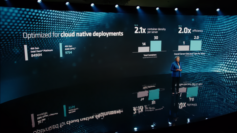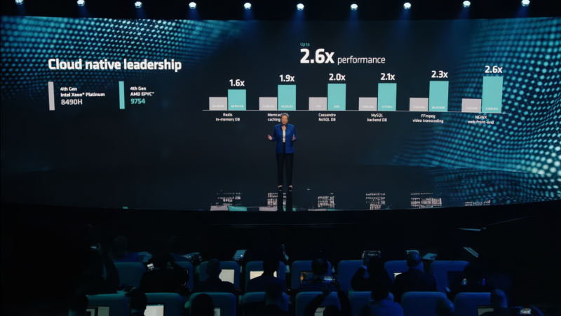 A AMD comparou o processador EPYC 9754 (Bergamo) com o Intel Xeon Platinum 8490H da série Sapphire Rapids. Em diversas tarefas relacionadas à computação em nuvem, o novo AMD foi até 2,6 vezes mais produtivo que o concorrente.