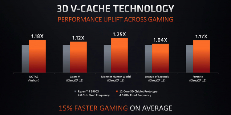Durante a conversa, um gráfico foi mostrado mostrando um aumento médio de 15% no desempenho de jogos devido à implementação da tecnologia 3D V-Cache em um protótipo de processador de 12 núcleos com uma velocidade de clock fixa de 4,0 GHz em comparação com o processador Ryzen 9 5900X, também operando em uma frequência fixa de 4,0 GHz.