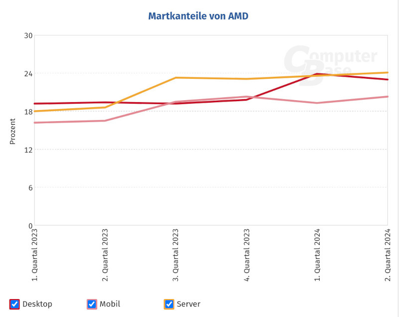 Participação de mercado da AMD nos segmentos de desktops, dispositivos móveis e servidores no período do primeiro trimestre de 2023 ao segundo trimestre de 2024