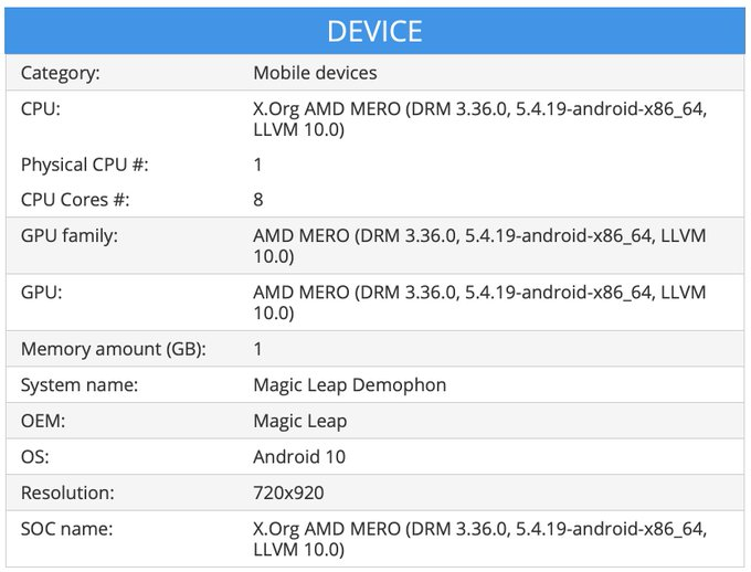 Como explica Tom’s Hardware, a partir de uma breve descrição da APU AMD Mero, fica claro que ela possui oito núcleos de processamento. O próprio dispositivo Magic Leap Demophon roda no Google Android 10, vem com 1GB de memória e suporta uma resolução de 720×920 pixels.
