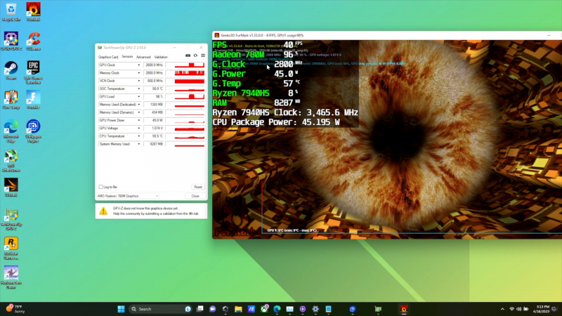 Observa-se que durante jogos e testes sintéticos, o consumo de energia do processador Ryzen 9 7940HS não ultrapassou 70 watts. Também deve ser destacado que os testes foram realizados usando uma versão beta do driver gráfico.