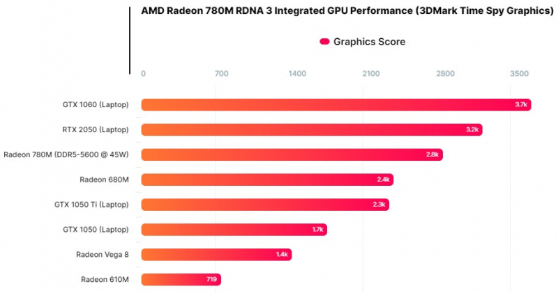 Em testes sintéticos, a Radeon 780M não conseguiu alcançar a GeForce RTX 1060 e a GeForce RTX 2050 móveis, marcando apenas 3.000 pontos no 3DMark Time Spy. Os concorrentes na mesma prova apresentaram resultados de cerca de 3,7 mil e 3,2 mil pontos, respectivamente.