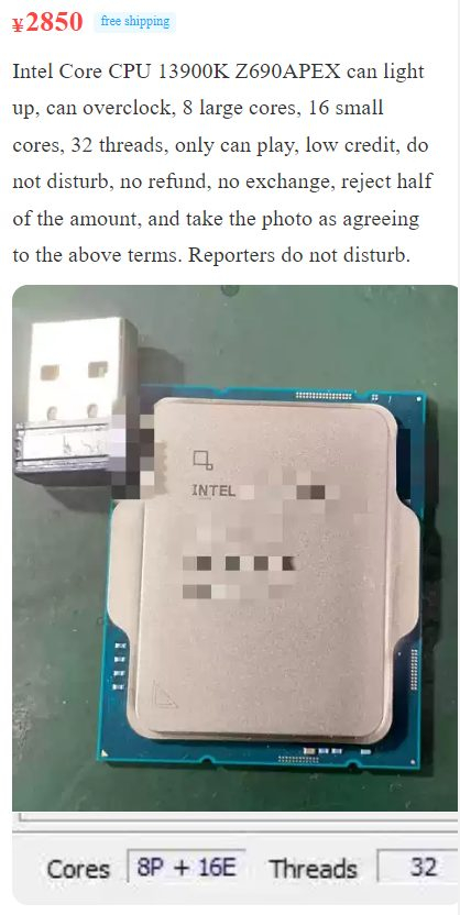 Em um desses leilões, uma amostra inicial de engenharia do futuro processador Core i9-13900K foi observada. O vendedor relata que o chip foi testado para funcionar com a placa-mãe ASUS Z690 ROG APEX. A descrição do produto ainda afirma que o processador suporta overclocking.