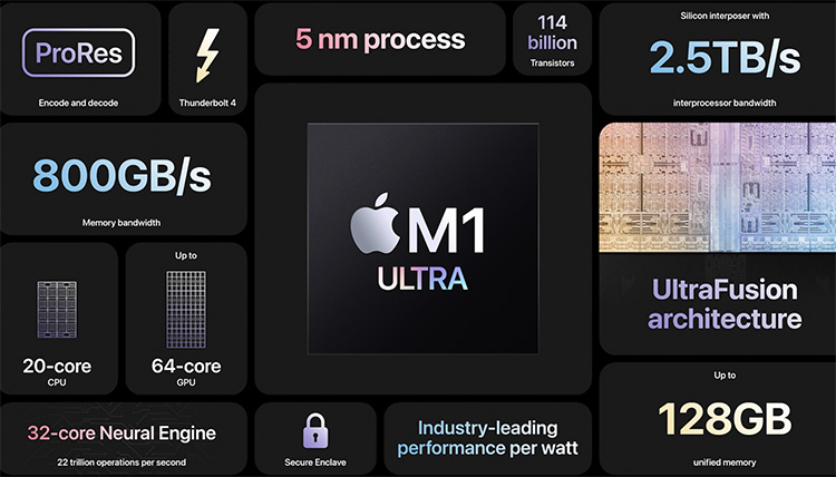 A principal característica do M1 Ultra é a arquitetura UltraFusion. Graças a ela, a Apple combinou dois chips M1 Max em um processador gigante. Isso foi possível por uma conexão entre processadores de 2,5 TB/s pré-provisionada no M1 Max. Como resultado, o M1 Ultra dobra o desempenho do M1 Max: o novo processador recebeu 20 núcleos de CPU (16 de desempenho e 4 de eficiência energética), 64 núcleos de GPU e um acelerador de IA de 32 núcleos.