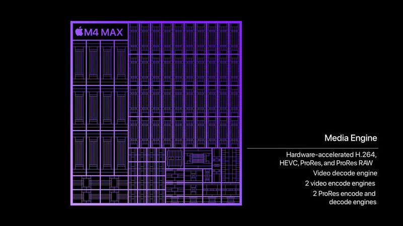 Mecanismo de mídia aprimorado M4 Max apresenta dois mecanismos de codificação de vídeo e dois aceleradores ProRes