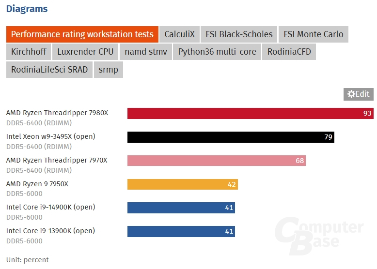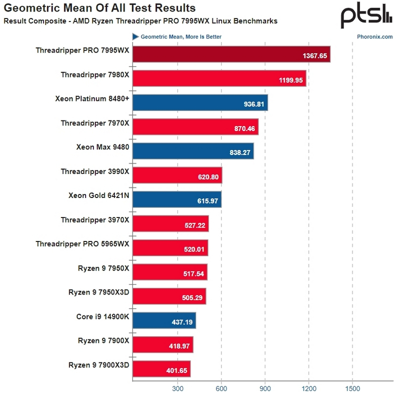 Por sua vez, o processador da família Ryzen Threadripper PRO 7000 testou apenas o recurso Phoronix, e em ambiente Linux. Estamos falando sobre o chip Ryzen Threadripper PRO 7995WX carro-chefe de 96 núcleos. É bastante esperado que o novo produto seja o processador mais rápido em todos os testes, à frente do Threadripper 7980X e de qualquer um dos modernos Intel Xeons. O AMD Ryzen Threadripper PRO 7995WX oferece desempenho aproximadamente 14% melhor que o Threadripper 7980X e também é até 46% mais rápido em cargas de trabalho como HPC, cargas de trabalho criativas como edição de fotos e vídeos, compilação de código e outras computações multithread. Platinum 8480+ é o Intel Sapphire Rapids mais rápido testado nesta análise. A única área onde houve competição entre o Intel Xeon e o Threadripper PRO 7995WX foram as redes neurais de aprendizagem profunda (TensorFlow), onde foram utilizados os recursos AMX do Sapphire Rapids.