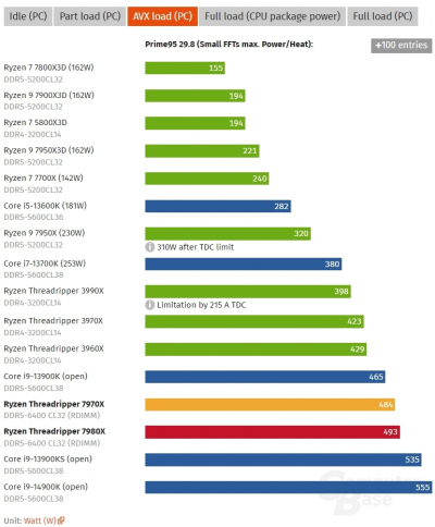 Quanto ao consumo de energia, mesmo quando ocioso, os Ryzen Threadripper 7970X e 7980X são capazes de consumir 83 e 95 W, respectivamente. A carga máxima fornecida no teste Prime95 elevou o consumo dos chips para 484 e 493 W, respectivamente, nos testes ComputerBase. E isso ainda é menor que o consumo do Core i9-14900K. Por sua vez, nos testes da AnandTech, o consumo do Prime95 foi de cerca de 350 W, enquanto o Intel Xeon W9-3945X consumiu cerca de 450 W.