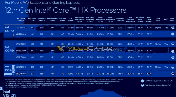 No entanto, Alder Lake-HX atrai a atenção não apenas por seu tamanho. Esta é uma nova série de chips com um TDP nominal de 55W, projetada para jogos de alto desempenho e estações de trabalho de classe entusiasta. Ao contrário de outras séries móveis Alder Lake, oferece mais núcleos físicos, mais potência e suporte para mais pistas PCIe.