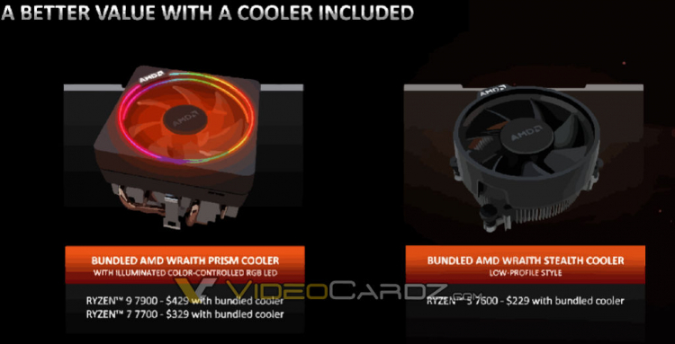 Os coolers de CPU AMD Socket AM4 são oficialmente compatíveis com o novo Socket AM5, portanto, os coolers AMD Wraith Prism e Wraith Stealth existentes serão fornecidos com versões em caixa de chips futuros. Junto com o Ryzen 9 7900 e Ryzen 7 7700, o cooler Wraith Prism será oferecido, o modelo Ryzen 5 7600 mais jovem receberá um cooler Wraith Stealth mais simples.