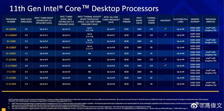 A Intel oferecerá cinco variantes do Core i9 e Core i7. O nível de TDP declarado de modelos com os sufixos “K” e “KF” no nome é 125 watts. A única diferença entre as versões KF dos processadores é a falta de um núcleo gráfico integrado UHD Graphics 750 na arquitetura Intel Xe. Assim, o sistema baseado neles exigirá uma placa de vídeo discreta. Os modelos sem o sufixo “K” têm um TDP nominal de 65W, não são para overclock manual e podem fazer overclock automático para 5,2 GHz. A frequência base desses processadores será 1 GHz menor do que a dos chips da série K. Também na lista está o Core i9-11900T com eficiência energética com 35W TDP e overclock automático de 4,9GHz. A frequência base deste chip é 2 GHz mais baixa do que a principal variante K e é de apenas 1,5 GHz.