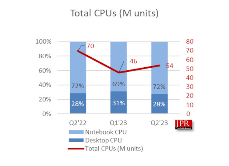 No segundo trimestre de 2023, as remessas de CPU para PC atingiram 53,6 milhões de unidades, um aumento de 17% em relação ao trimestre anterior, de acordo com a JPR. Se compararmos as remessas de CPU ano a ano, as remessas totais de processadores (incluindo todas as plataformas e tipos de processadores, com e sem gráficos integrados) diminuíram 23%. As remessas de CPU para desktop caíram 25% e as remessas de CPU para notebook caíram 22%. Em termos de distribuição de mercado entre os fabricantes de processadores, a participação da AMD no setor de CPU diminuiu 5,3% desde o último trimestre, enquanto a participação da Intel aumentou 23%.