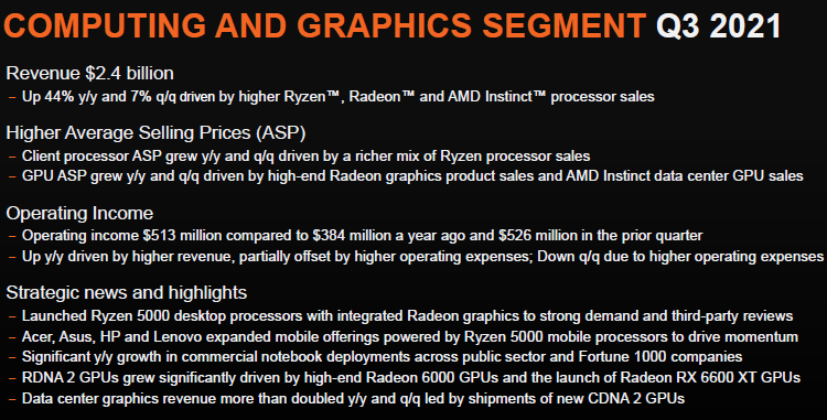 Esse princípio é bem ilustrado pelas tendências no preço médio de venda dos produtos AMD no segmento de computação e gráficos, que inclui CPUs de consumo e todas as GPUs da marca. Em relação ao terceiro trimestre do ano passado, o preço médio de venda de uma unidade convencional desse produto aumentou 83% de uma só vez, mas a quantidade de produtos expedidos diminuiu 23%. Como você pode entender, embora isso tenha limitado o aumento da receita, foi um valor bastante otimista de 44%.