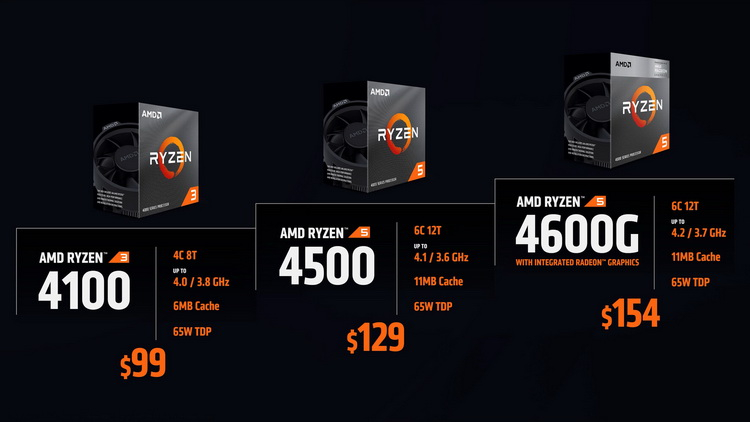 Também está à venda um trio de processadores Ryzen 4000 Renoir energeticamente eficientes baseados na arquitetura Zen 2. Os Ryzen 5 4600G e Ryzen 5 4500 de seis núcleos e 12 threads receberam um preço recomendado de US$ 154 e US$ 129, respectivamente. E o modelo e o Ryzen 3 4100 custam US$ 99.