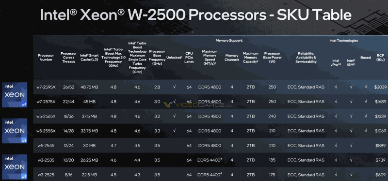 A série de processadores Xeon W-2500 consiste em modelos de 26, 22, 18, 14, 12, 10 e 8 núcleos. Os modelos de 10 e 8 núcleos suportam memória DDR5-4400, o que os diferencia de outros modelos desta linha. O chip mais acessível da série é o chip Xeon W3-2525, custando US$ 609.