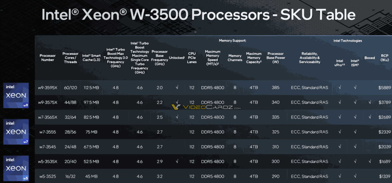 Além do carro-chefe Xeon W9-3595X, a linha de processadores Xeon W-3500 oferece suporte para overclock para modelos de 44, 32 e 20 núcleos. Ambas as séries de processadores Xeon W-3500 e W-2500 são compatíveis com a mesma plataforma de seus antecessores – os novos produtos são projetados para funcionar com placas-mãe baseadas no chipset Intel W790 com soquete de processador LGA 4677.