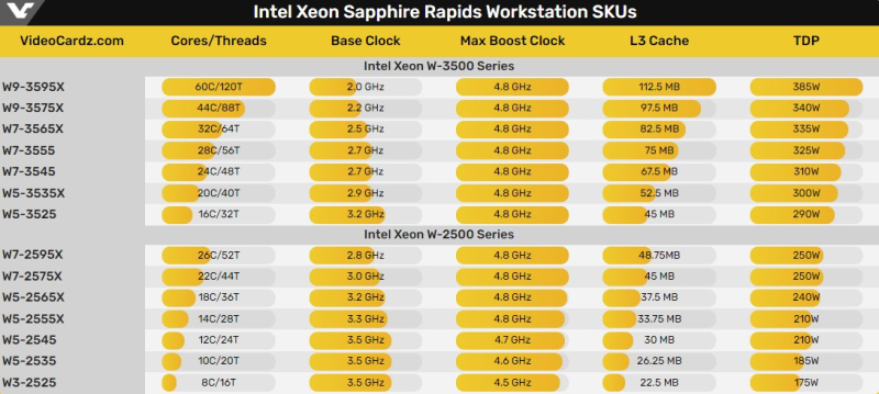 O principal processador da linha é o Xeon W9-3595X de 60 núcleos e 120 threads. Ele tem uma frequência base de 2,0 GHz e pode fazer overclock automaticamente para 4,8 GHz. A potência básica do processador (PBP) é declarada em 385 W. O custo do chip é de US$ 5.889.