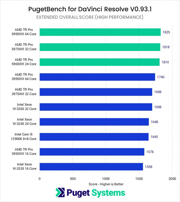 Apesar do mesmo número de núcleos, o desempenho multithread do Ryzen Threadripper Pro 5000WX melhorou significativamente em comparação com a geração anterior. O Ryzen Threadripper Pro 5995WX de 64 núcleos, 5975WX de 32 núcleos, 5965WX de 24 núcleos, Ryzen Threadripper 3995WX de 64 núcleos, 3975WX de 32 núcleos e 3955WX de 16 núcleos participaram dos testes. Da Intel vieram o Xeon W-3365 e W-3345 de 24 núcleos, o W-3335 de 16 núcleos e o carro-chefe de consumo de 16 núcleos Core i9-12900K (Alder Lake).