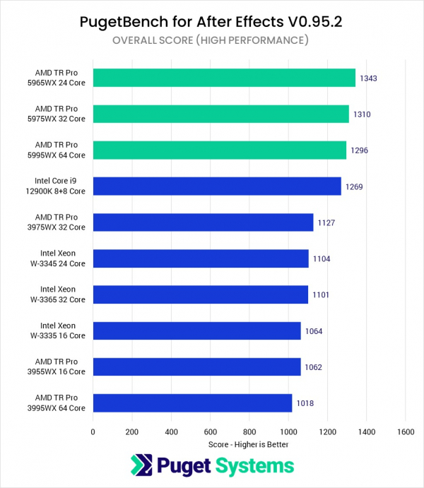 No Adobe Premiere Pro, o Ryzen Threadripper Pro 5995WX, 5975WX e 5965WX foram 10-20% mais rápidos do que todos os Xeons na comparação e superaram a geração anterior Ryzen Threadripper em 7-23%. A exceção foi o Core i9-12900K de consumo, que obteve a pontuação mais alta no teste. Tudo graças a recursos de codificação e decodificação de vídeo mais poderosos. No entanto, os chips AMD estão apenas alguns por cento atrás.