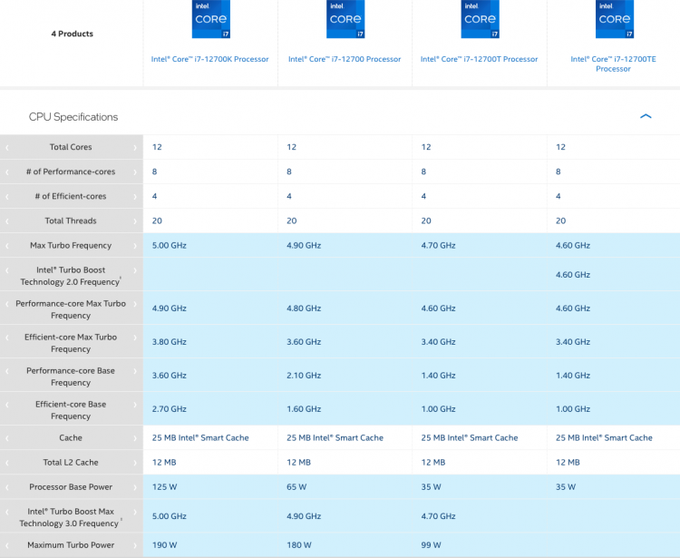 Embora os chips Intel Core T-series com eficiência energética tenham o mesmo número de núcleos de desempenho e eficiência energética que as versões regulares do Alder Lake, eles operam em uma faixa de frequência mais baixa. As características detalhadas desses processadores e seus preços recomendados podem ser encontrados na tabela abaixo.