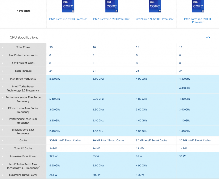 A boa notícia é que com um sistema de refrigeração eficiente, esses chips podem atingir frequências mais altas devido ao suporte à tecnologia Turbo Boost. Ao mesmo tempo, o nível máximo de consumo de energia do mesmo modelo Core i9-12900T neste caso será de apenas 109 W em vez de 241 W para o Core i9-12900K.