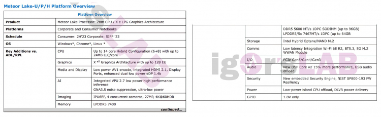 De acordo com o LAB de Igor, os processadores das séries Meteor Lake-H e Meteor Lake-P poderão oferecer até 14 núcleos físicos (6 núcleos P e 8 núcleos E). Por sua vez, os modelos da série Meteor Lake-U receberão até 12 núcleos. Sabe-se também que a nova arquitetura suportará RAM DDR5-5600 e LPDDR5/LPDDR5X-7467. Os sistemas baseados em Meteor Lake poderão oferecer até 96 GB de RAM DDR5 ou até 64 GB de RAM LPDDR5.