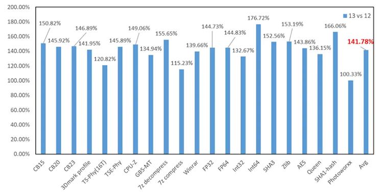 Uma comparação do Core i9-13900K e Core i9-12900K em tarefas de computação mostrou que o novo processador oferece desempenho 42% mais rápido. Este valor é composto tanto pela vantagem em frequências quanto pelo aumento do IPC (performance específica por clock). O ganho de desempenho na mesma frequência foi estimado por entusiastas chineses em 13% para núcleos produtivos e 6% para núcleos com eficiência energética.