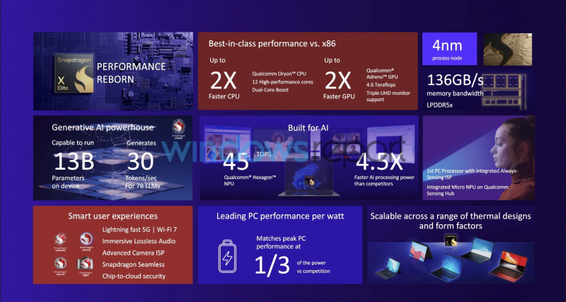 O Snapdragon X Elite usará 12 núcleos de computação Oryon com arquitetura de 64 bits, produzidos com tecnologia de processo de 4 nm. Com todos os núcleos ativos, o processador será capaz de operar em frequências de até 3,8 GHz, e com um ou dois núcleos terá overclock automático para 4,3 GHz. No novo chip, o fabricante prestou atenção significativa à expansão do suporte para diversas funções e algoritmos de IA, cuja operação será fornecida pelo coprocessador de IA Hexagon NPU (Unidade de Processamento Neural). Graças a isso, o Snapdragon X Elite promete um desempenho combinado de 45 TOPS (trilhões de operações por segundo). Isso é 55% maior que seu antecessor Snapdragon 8cx Gen3. A Qualcomm afirma que seu chip será capaz de oferecer níveis semelhantes de desempenho com 1/3 da potência necessária em comparação aos concorrentes. Infelizmente, a empresa não especifica a qual concorrente específico se refere.