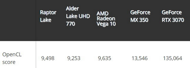 Quando comparado com seus concorrentes mais próximos, os gráficos Raptor Lake se mostraram mais lentos que o AMD Radeon Vega 10 “embutido”, a placa de vídeo móvel discreta de nível básico NVIDIA GeForce MX350 ou a mesma GeForce GTX 750 e Radeon RX 540. Por outro lado, deve-se ter em mente que o teste provavelmente foi realizado em uma amostra de engenharia do Raptor Lake e os números finais de desempenho gráfico integrado podem diferir, embora pouco significativamente.