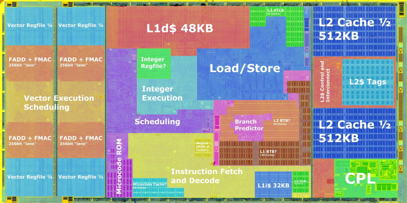 Cada núcleo Zen 5 é maior que o Zen 4 (fabricado usando tecnologia de processo TSMC N5) devido ao uso de uma unidade FPU com suporte nativo para dados de 512 bits para o AVX-512. O Vector Engine está localizado na borda do núcleo. Isso faz sentido, pois a FPU é o componente mais quente do núcleo da CPU. Na outra extremidade do núcleo, mais próximo do cache L3 compartilhado, existem dois blocos de cache L2 de 512 KB. A AMD dobrou a largura de banda e a associatividade deste cache em comparação com o Zen 4.