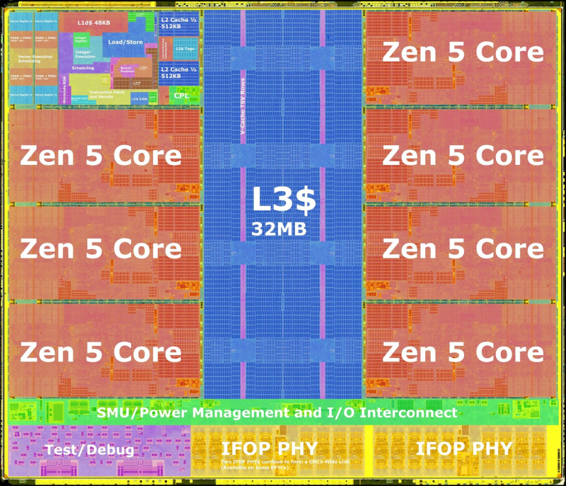 Os núcleos nos processadores CCD Granite Ridge estão localizados mais próximos uns dos outros do que nos processadores CCD Raphael Zen 4. Cada CCD Granite Ridge contém 8 núcleos Zen 5 de tamanho normal, cada um com 1 MB de cache L2. Na parte central do CCD estão 32 MB de memória cache L3, distribuídos entre os núcleos. Outros componentes do CCD são o controlador de controle SMU (System Management Unit) e a implementação física do barramento Infinity Fabric over Package (IFoP), que é necessário para conectar os chips CCD e cIOD.